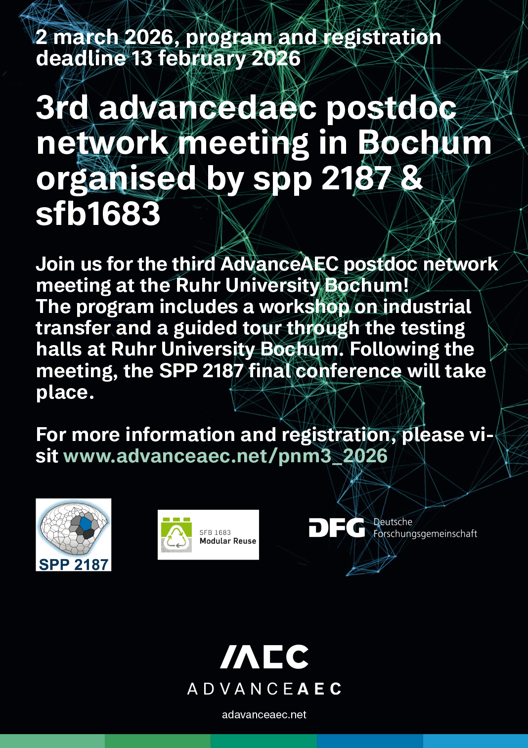 Ruhr University Bochum, SPP 2187 & SFB 1683 2. march 2026 Join us for the third AdvanceAEC postdoc network meeting at the Ruhr University Bochum! The program includes a workshop on industrial transfer and a guided tour through the testing halls at Ruhr University Bochum. Following the meeting, the SPP 2187 final conference will take place. The conference is being held jointly with the research networks SFB 1683 and SFB/TRR 277. program and the registration form is available to AdvanceAEC network partners. Ruhr University Bochum Vera Grüber Karolin Tampe-Mai Get noticed! Take advantage of the special promotion opportunity and click the box on the pre-registration form below to activate your profile on the dedicated Postdoc Network page on the AAEC website: postdoc network – AdvanceAEC Your tile will be drawn directly from your personal profile page. (A video tutorial on how to shape your profile can be found here: Shape your profile for best visibility – AdvanceAEC. The mission of the AdvanceAEC Postdoc Network is to support and empower early career researchers in the AAEC network in their professional development and facilitate networking and collaboration.