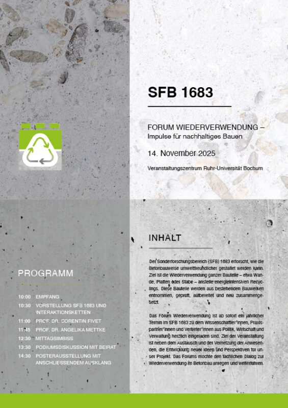 Der Sonderforschungsbereich 1683 lädt herzlich ein zum Forum Wiederverwendung. Angesprochen sind Vertreterinnen und Vertreter der Wissenschaft, der Ingenieurpraxis, der Verwaltung und der Politik. Das Forum bringt Expertinnen und Experten im Feld des nach haltigen, zirkulären Bauens zusammen, um neuste Trends und Entwicklungen vorzustellen und zu diskutieren. Freuen Sie sich auf ausgewählte Fachpräsentationen, Podiumsdiskussion, eine Posterausstellung mit realen Demonstratoren und viel Raum für Vernetzung und den persönlichen Austausch.